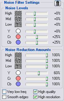 Noise reduction amounts can be in the range from 0% (none of the detected noise is removed) to 100% (all the detected noise is removed). By default, the noise filter removes 100% of detected noise (some of the noise reduction amount defaults may be different from 100%).