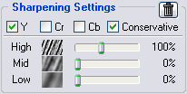 The default values of the sharpening settings should produce satisfactory results (when sharpening is enabled for any of the channel components) but you are encouraged to vary the settings to find values that produce the desired level of sharpness. Zero sharpening amounts will not sharpen the image at all. The non-zero sharpening amounts will apply sharpening of the specified strength. Use sharpening controls for different frequency components to sharpen fine, medium or large image details. As with any other sharpening method, you have to balance the amounts to avoid over-sharpening.